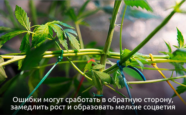 • Неправильная техника выполнения тренировок. Различные техники обучения конопли призваны улучшить показатели урожайности и ограничить вертикальный рост кустов. Но работают они, только если выполнять процедуры в строго выделенный промежуток времени и в соответствии с инструкцией. Допущенные ошибки могут сработать в обратную сторону, то есть замедлить рост и привести к образованию мелких и недоразвитых соцветий. Дабы избежать подобных ситуаций в реальности, рекомендуем ознакомиться с подробным описанием выполнения различных техник выращивания конопли на официальном форуме «Семяныча».