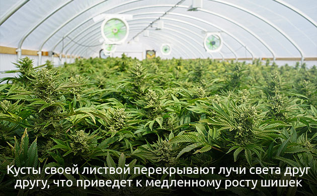 • Слишком густая высадка или выращивание с плохим освещением. И в первом, и во втором случае растения будут испытывать нехватку света. Соседствующие кусты своей листвой перекрывают лучи света друг другу, что на стадии цветения приведет к медленному и скудному росту бутонов в затененных участках. Аналогичная ситуация и со слабым освещением в индоре. Оптимальное количество световой энергии получат разве что самые верхние шишки, а все, что находится ниже, будет мелким и недоразвитым.
