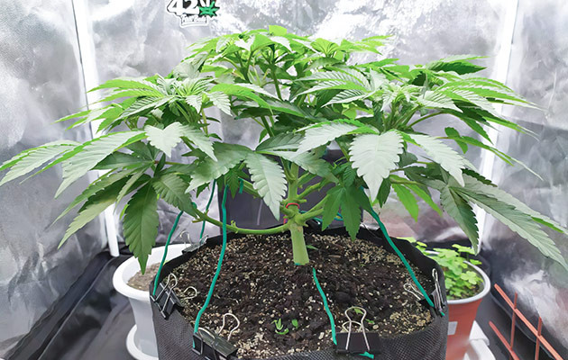 На второй неделе пришла пора пересаживать кустик. Предварительно сделал лунку и пролил верхний слой почвы раствором с жидкой микоризой и триходермой. После этого пересадил растиху. Земля с корневым комом была довольно сухая, что меня беспокоило. Но кустик спокойно перенес переезд в 15-литровый гроубэг и бодро приступил к адаптации к новым условиям. В конце недели начал аккуратно гнуть растиху, закрепив её у основания в противоположную от LST сторону, готовя к более серьезным тренировкам. На данном этапе рост кустика был около 10 сантиметров.