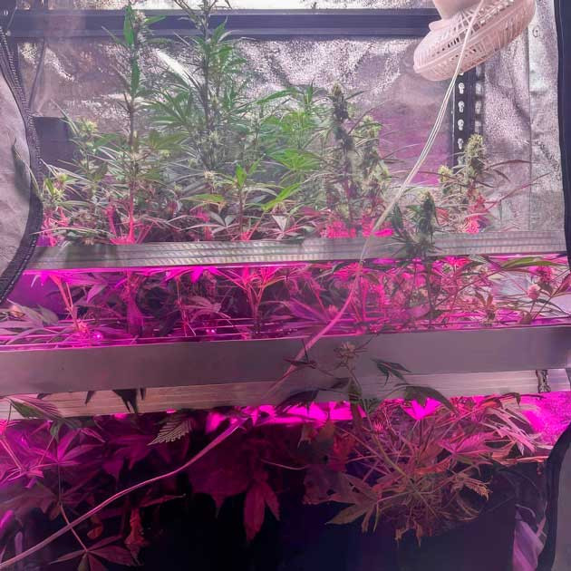Работы в боксе: обрезка нижних листьев, регулировка скрога, немного ручной дефолиации, которые перекрывали свет. Параллельно следил за дренажом и цветом воды, всё чисто, без запахов, значит, корневая работает корректно. Поставил вентилятор чуть выше, чтобы усилить циркуляцию в центральной части растишек.