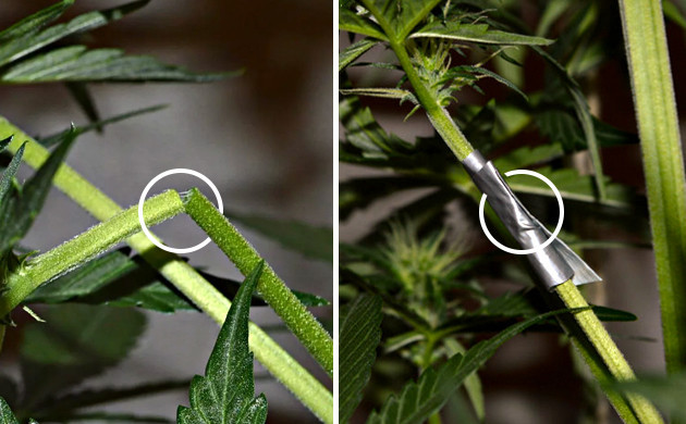 - Если в процессе загиба внешняя часть стебля повредилась, не паникуйте. Возможно, все не так плохо. Просто зафиксируйте место залома в нужном положении при помощи скотча, изоленты или других подручных средств. Если поражение не критичное, то со временем оно также срастется. Проверьте состояние растения через неделю, если все будет в норме, то изоленту можно будет убирать.