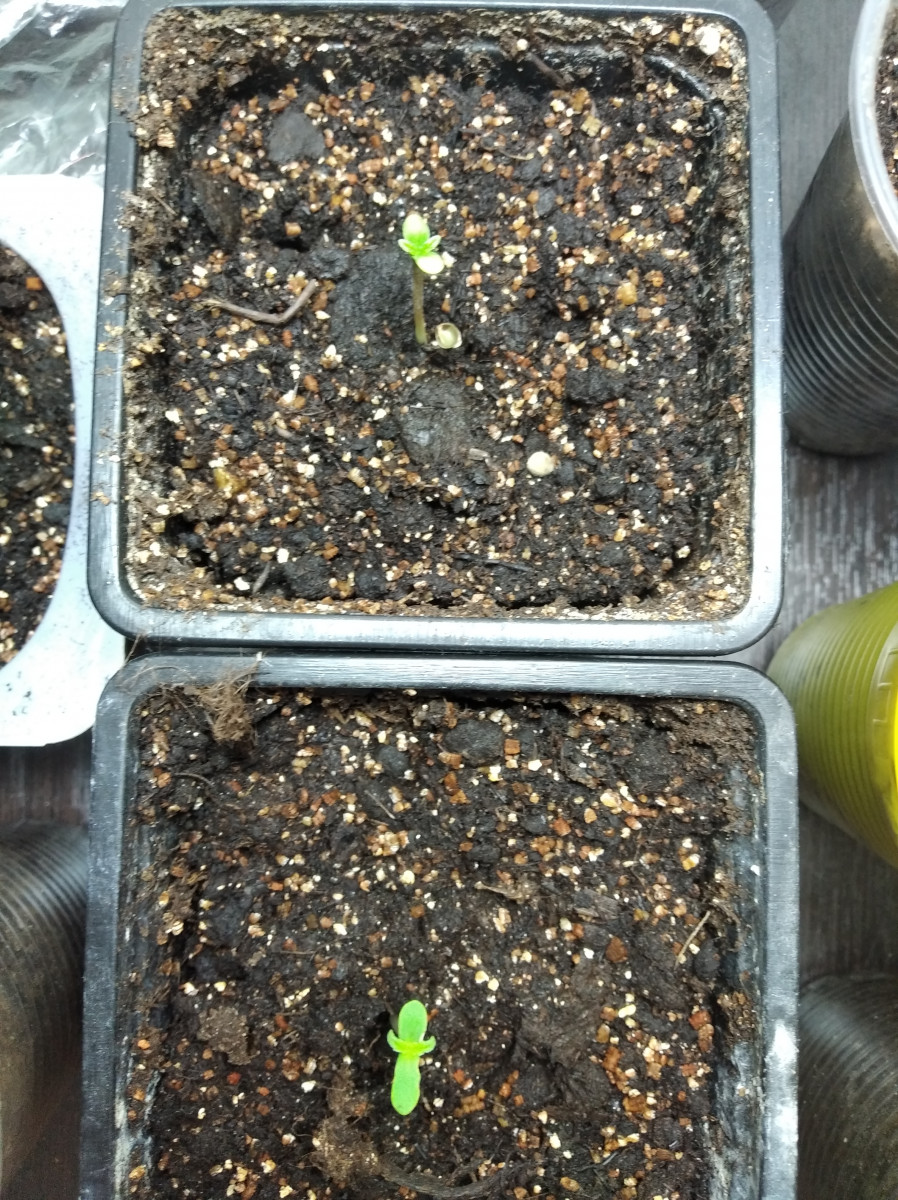 Высадил 2 сразу в стаканы с почвой. Через 3 суток взошли. Ростки хороши без изъянов. Что сказать, потенциал большой, тяга к жизни впечатляет. На фото 1 день от каски