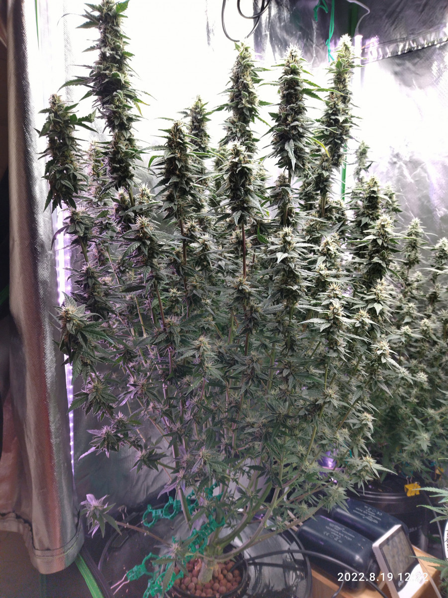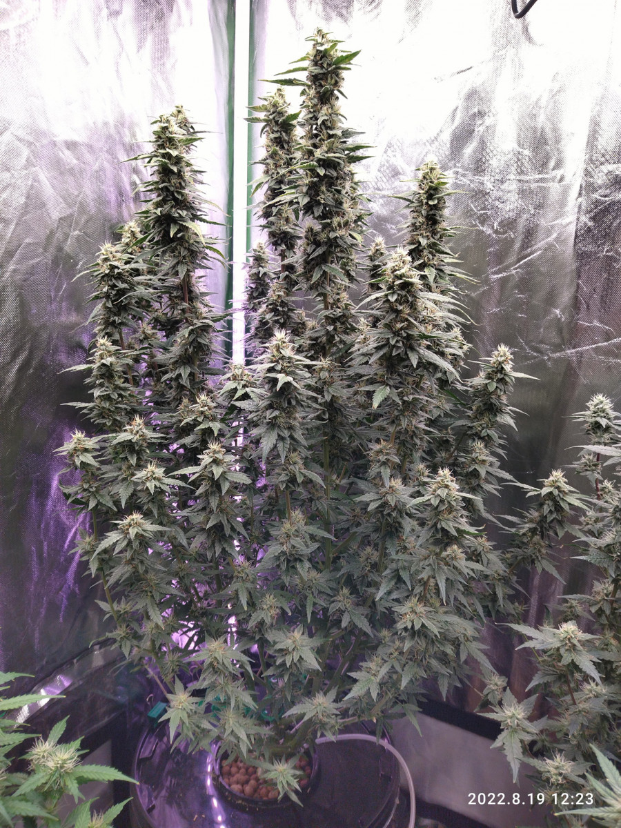 Понравился эффект , хорошо растет , при лст нарастил до цветения 15 веток , штук 6 обогнали центральную , остальные тоже плюс минус вровень. Рост вышел 80 см , несмотря на жару в боксе за 30 и кривой пш. Трихомы везде на листьях и снаружи и снутри , куст обсыпан снегом, прям весь белый. Щипал его с голодухи немного по итогу сухого вышло 85 гр. Кормил гхе на кранухе , жрет всё , сколько ни налей, горшок 15 литров, рос три месяца.