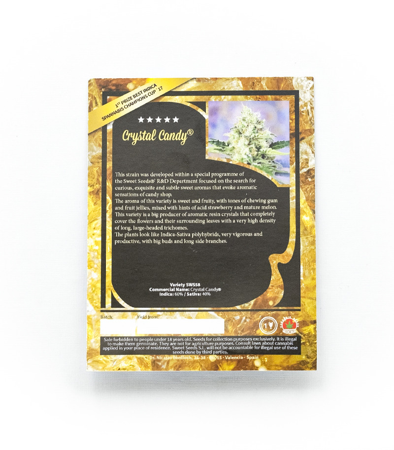 Crystal Candy от Sweet Seeds – это сорт конопли, который придется по вкусу любителям чего послаще. Всего за год существования он прославился как один из самых сладких сортов конопли, когда-либо существовавших на рынке и получил 1-е место в номинации «Лучший индичный сорт» на Spannabis’17.