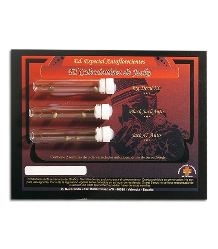 Коллекция продукции испанского сидбанка Sweet Seeds – семена конопли El Coleccionista de Jacks. В этом миксе рука об руку идут разные наследники именитого сорта Jack Herer – Black Jack Auto, Jack 47 Auto и Big Devil XL. Все гибриды очень просты в уходе и подойдут для начинающих садоводов.
