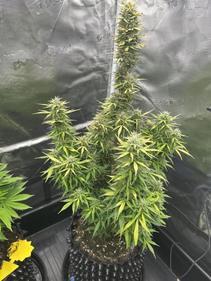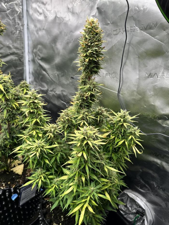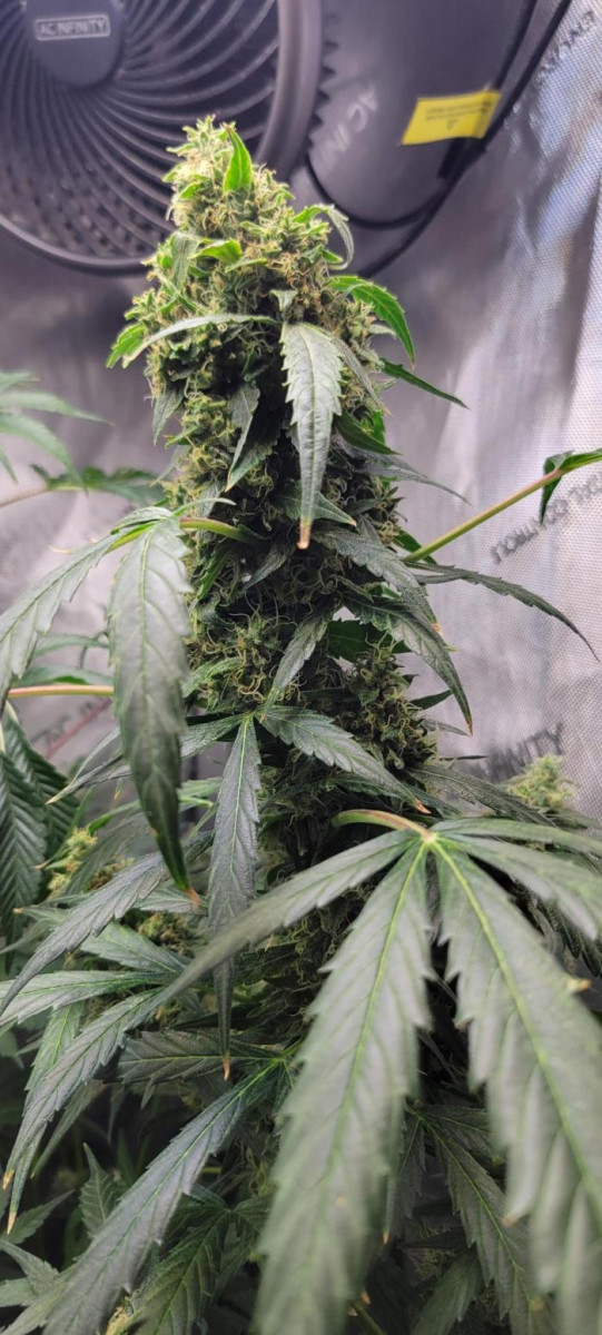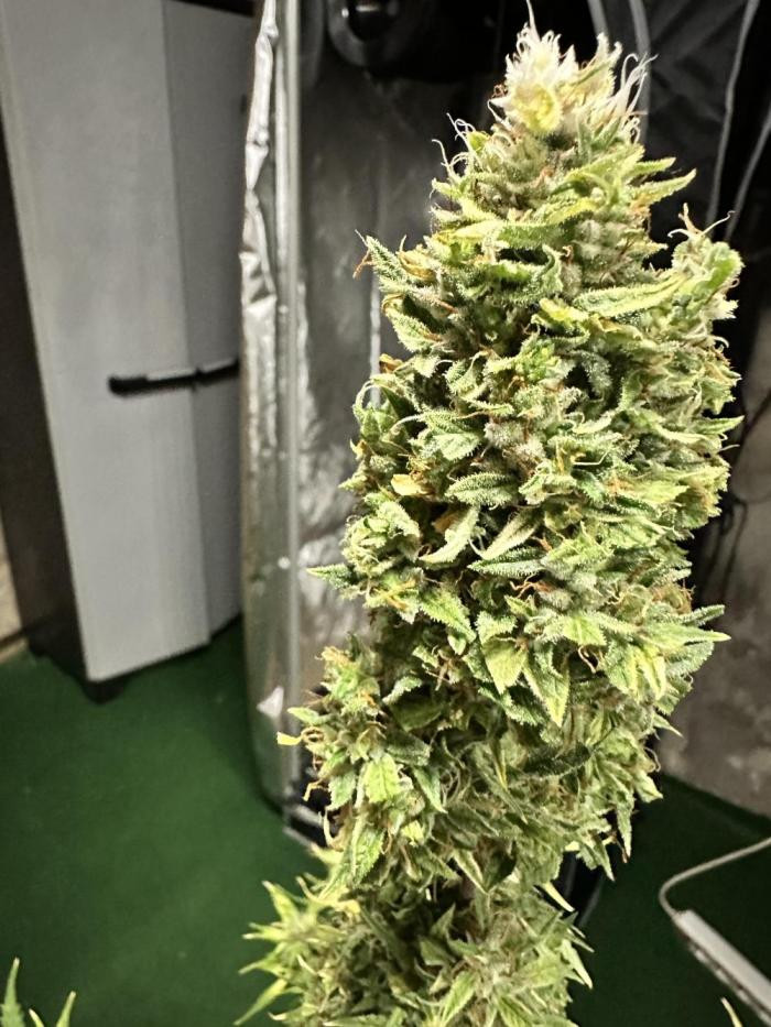 Интересный автоцвет. Зацвел в 5 недель и сразу же показал мощный скачок роста. Став самым высоким в палатке, даже выше фотиков, которые на неделю старше и были крупнее. Узлы на верхушке стали плотнее, а вот сильного запаха не было вплоть до пары недель перед харвестом. Тогда появился выраженный запах чего-то сладкого и фанкового, будто лошадиный пот.