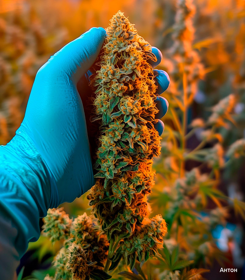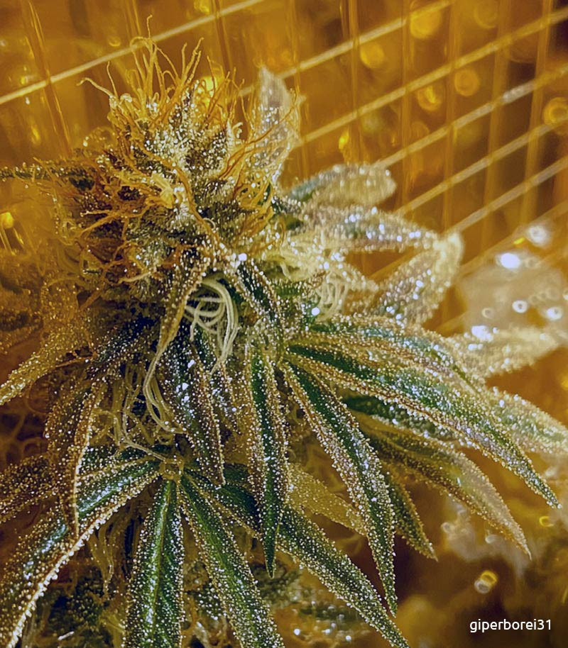 Выхлоп 163 грамма при некрупных габаритах куста, но за счет мясистых толстых кол. Харвест состоялся в конце 16 недели – самый обычный срок для фотопериодного сорта в индоре. К тому моменту 80% трихом уже были мутными и даже было около 15% янтаря.