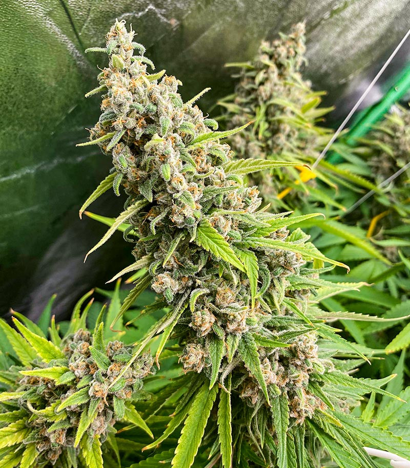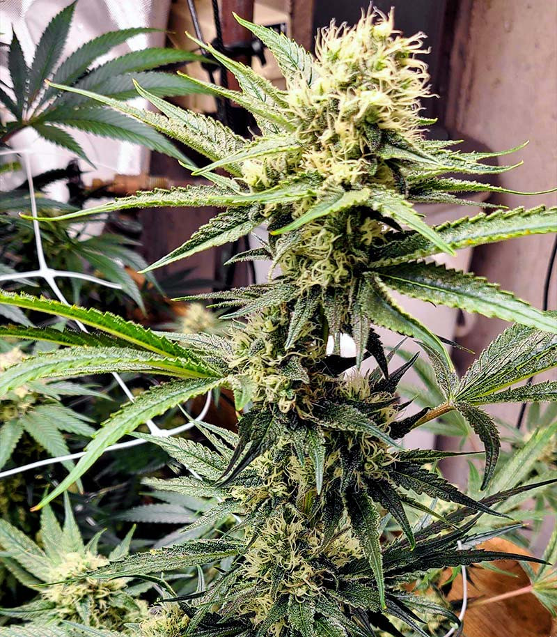 Тёмное зерно c правильным рисунком, внушающее доверие. В развитии на фото отдельным от остальных не уступал регулярам White Widow. Принёс потомство крупнее обоих родителей.