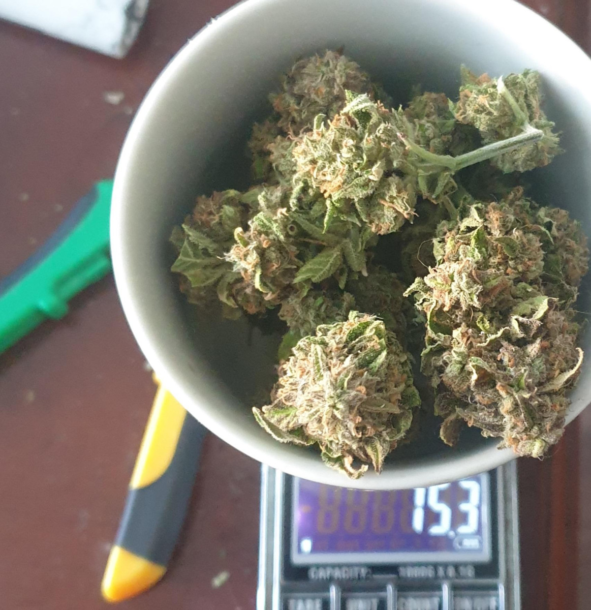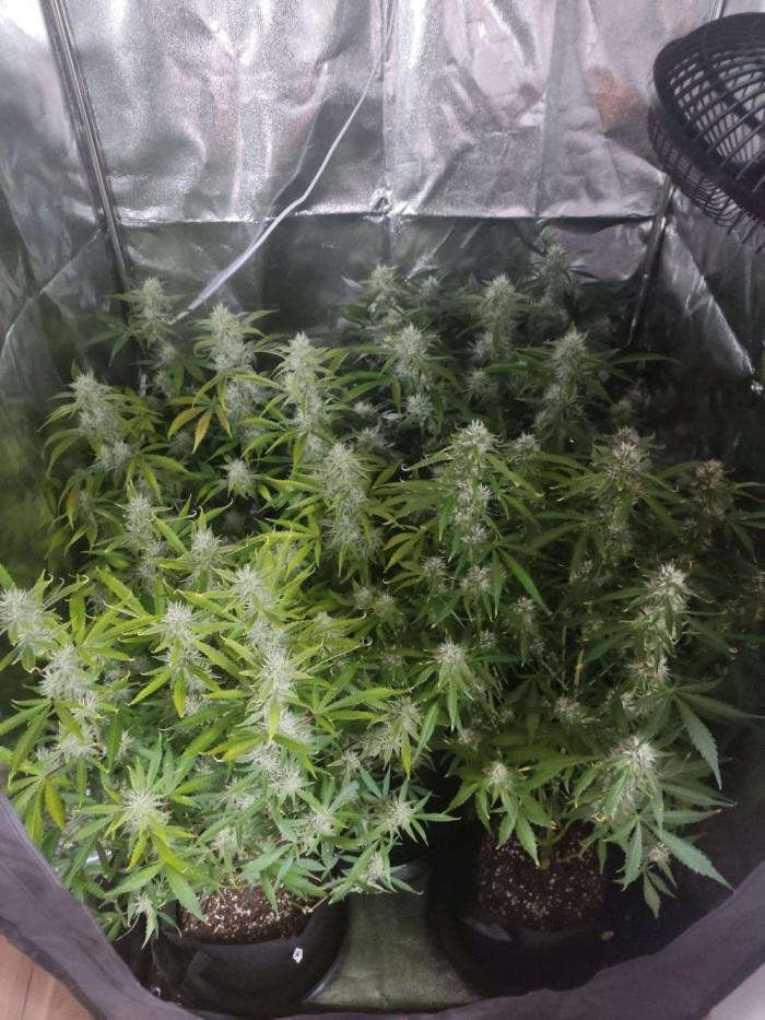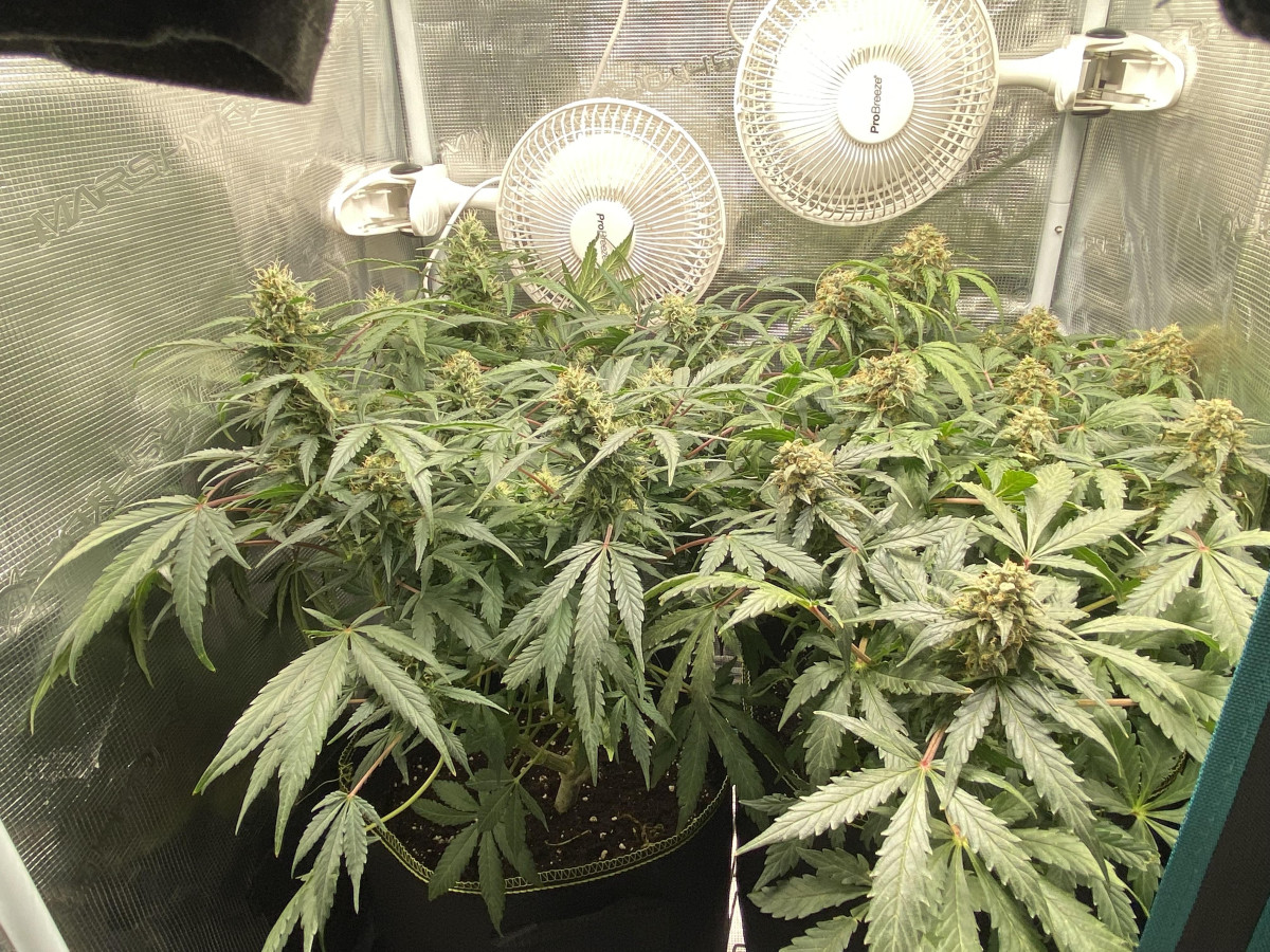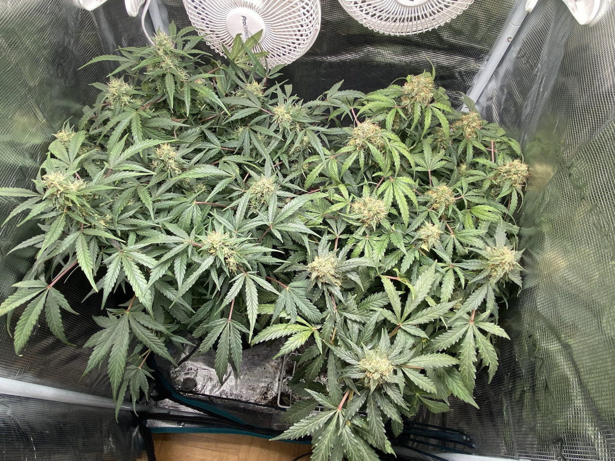 Мне пришлось его харвить немного раньше оптимального пика зрелости, потому что на шишках образовалась небольшая плесень, так как 5 растений в 11-литровых горшках в палатке размером 80x80 см — это многовато.