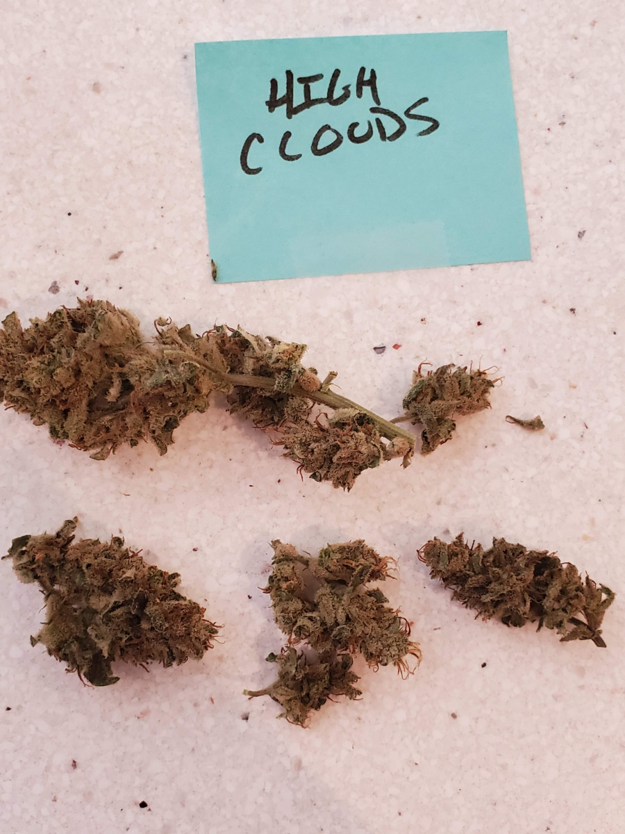 High cloudz было легко выращивать. Урожай был собран через 8 недель от высадки. Шишки плотные, но маленькие. Одна из самых больших шишек была 3,8 см. Большинство имеют размер 2,5 см или меньше. Вес сухих шишек 20 г и 7 г приходится на обрезки.