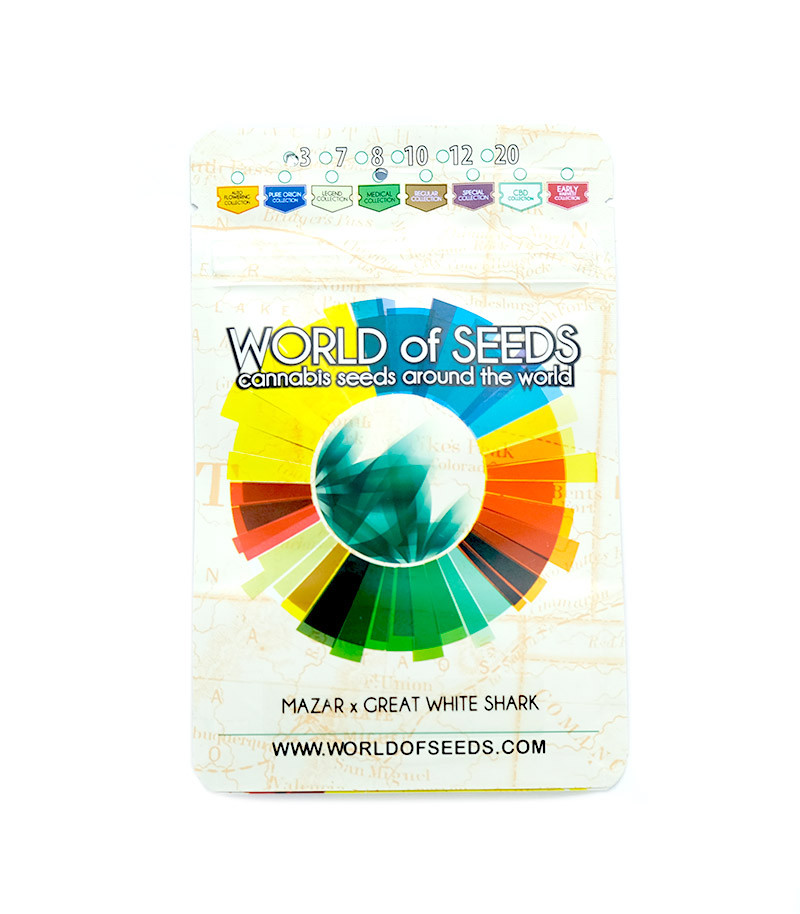 Семена сорта Mazar X Great White Shark fem (World of Seeds) Испания, Феминизированные, Фотопериодные, ТГК-20
