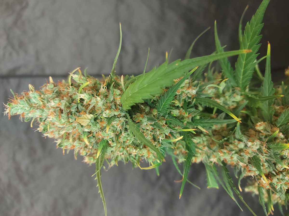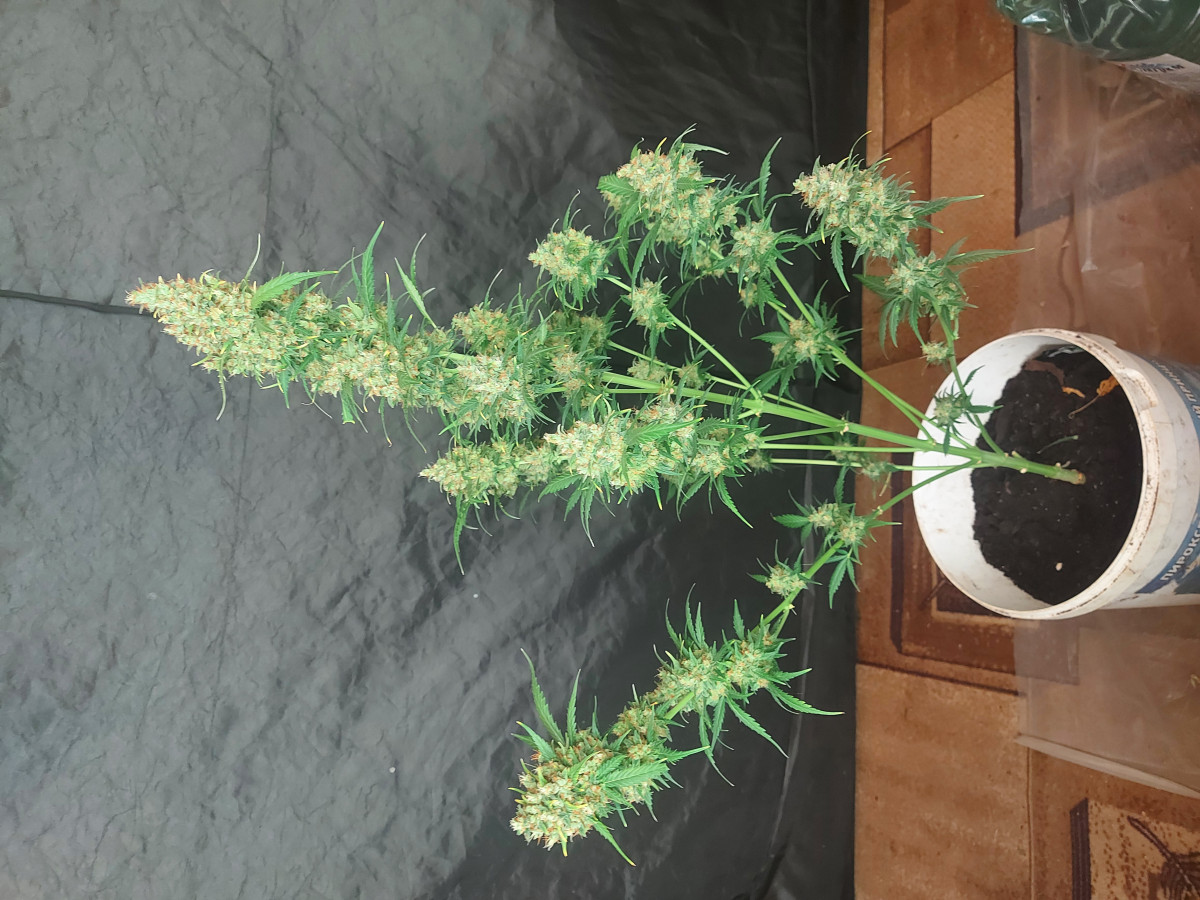 Получил в подарок от Семяныча одно зернышко данного сорта. Вырос за 90 дней, в режиме 12/12 , в компании фотопериодных сортов. На фото не хватает 4 нижних веток, я их съел в процессе) Тонкости вкуса не понял, все таки нижние побеги, но убивает знатно. Лучше только Мимоза Оранж от Барни.