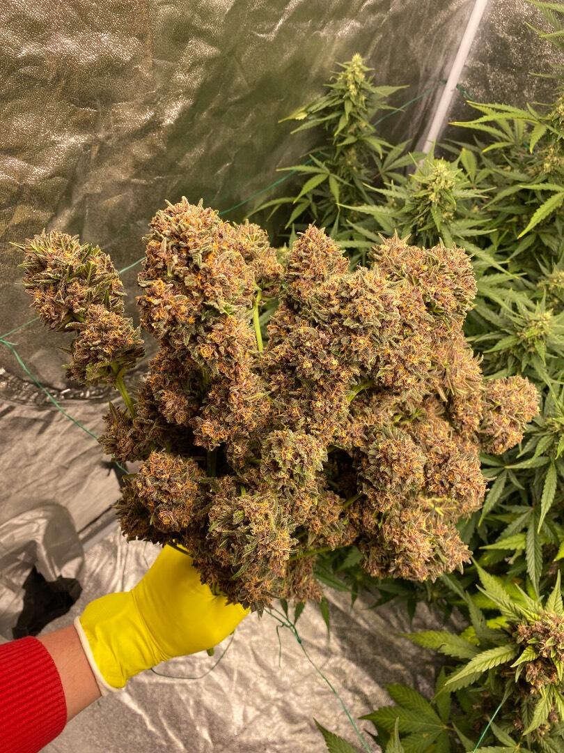Это была ее последняя неделя, и теперь она готова. День 84 — ее последний день в палатке, теперь я помещаю ее на 72-часовой период темноты, а затем собираю урожай. Она пахнет так приятно и сладко. Бутоны толстые, но выглядят воздушными, после высыхания увидим. Во время последнего полива я положил немного льда на поверхность почвы, чтобы стимулировать появление большего количества трихом.