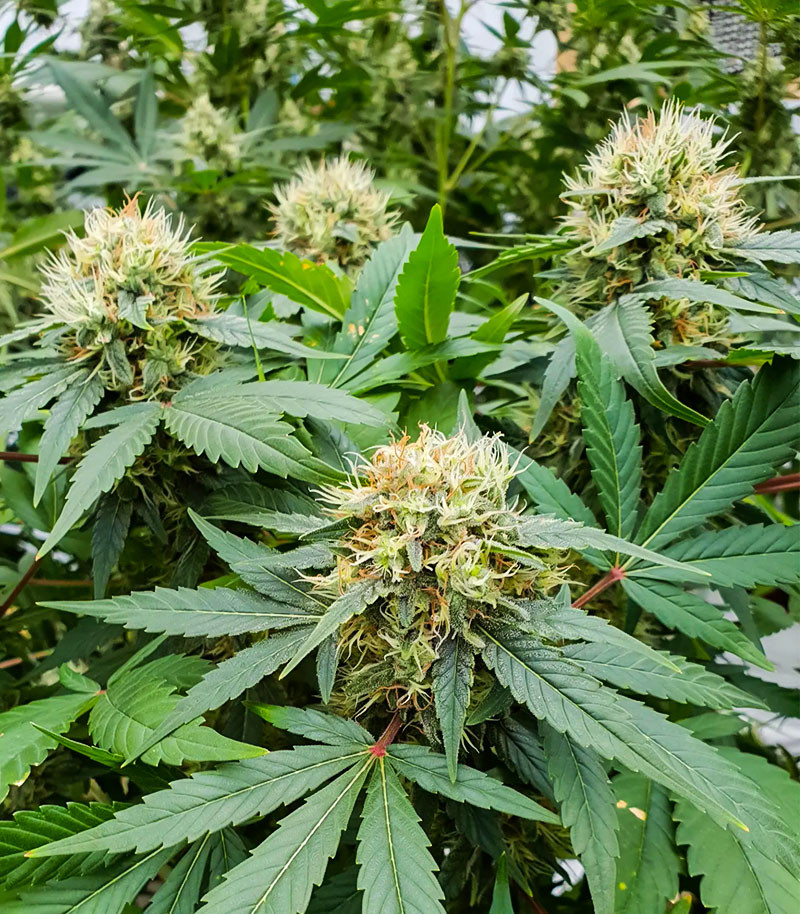 В среднем одному растению требуется около 10-11 недель, чтобы пройти путь от прорастания семечки до харвеста. Кусты вырастают компактными, но разветвленными. Плотная крона со смолистыми соцветиями покрывается белоснежными трихомами с вкраплениями ярко-оранжевых пестиков.
