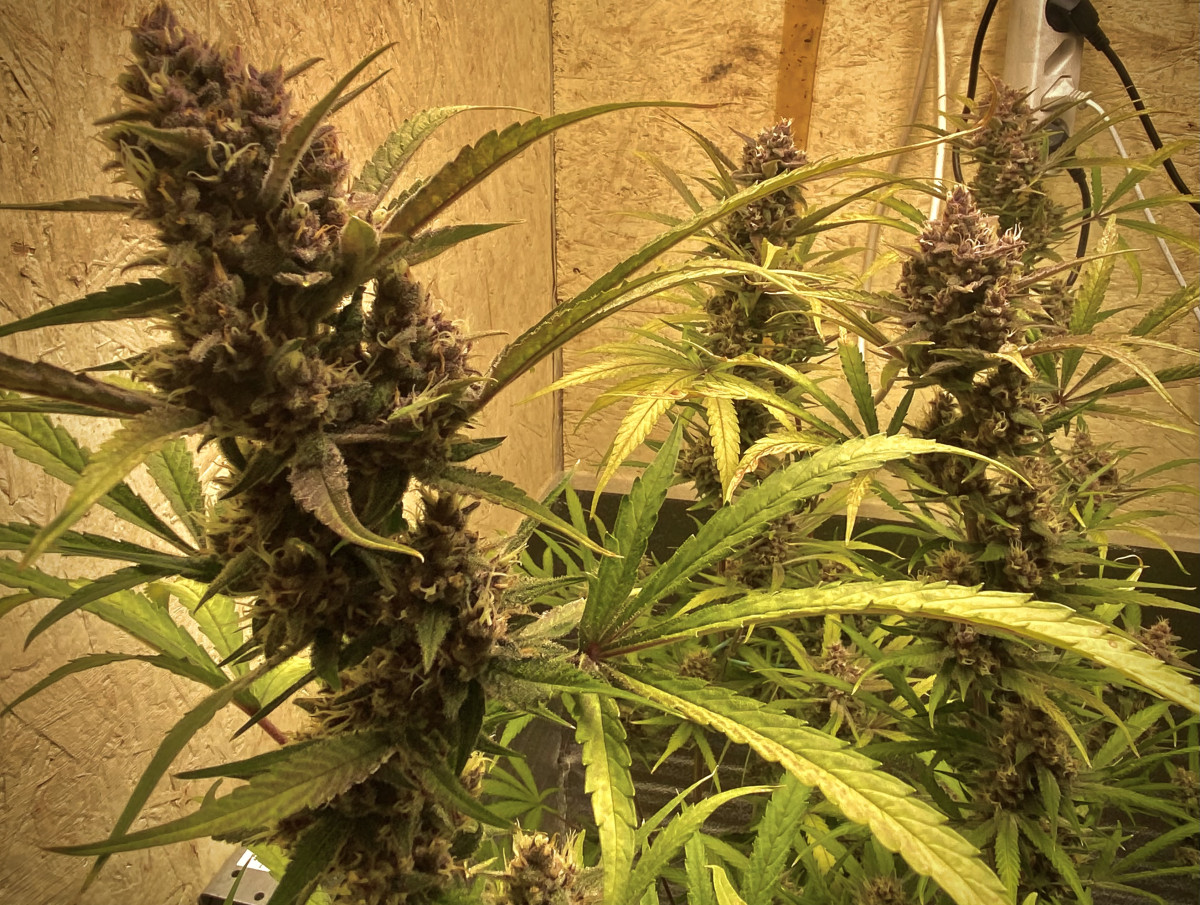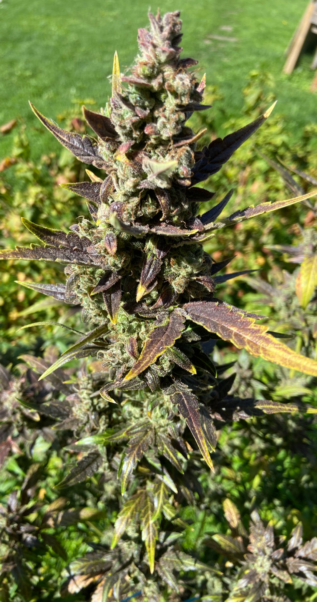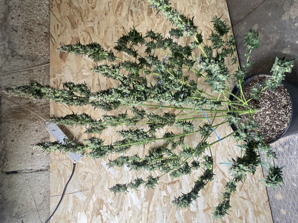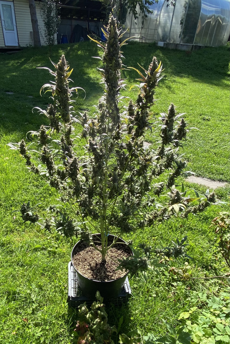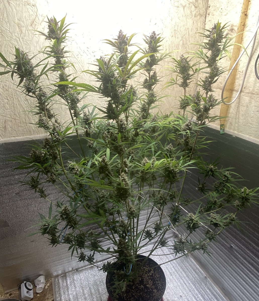Быстро взошла и пошла в рост. Топинг делать не стал, ограничился тем, что убирал листья с верхушки, дабы боковые побеги догнали основную коллу. К 35дню это «сумасшедшая женщина» вымахала до 130см!!! Я честно говоря прибывал в шоке! Куда мне такое дерево!? Ну что поделать, идём дальше. Горшок был маленький 15литров. Свет использовал лампу 240w. По началу выносил на солнце (живу за городом). Ближе к 45 дню,она начала пахнуть так, я думал соседи меня спалят по любому. Было такое чувство, сто у меня целая плантация! Духан стоял на всю округу. 5минут пребывания рядом с этой дамой и вся одежда насквозь пропитывалась запахом. Если потрогать,что руки потом будут пахнуть и трудно отмыть! В общем имейте ввиду. Ближе к 58 дню,запах сменился, стал менее резким и более цветочным. Соцветия стали очень жирными и липкими. Пила эта красавица,как Кощей бессмертный по 5литров в день!! Приходилось поливать два раза на дню, по 2,5л. Подкормку давал раз в два дня. Куст получился осень пышным и раскидистым. Думаю что техника LST была бы тут умесна. Или сетка скрог. Но я не стал заморачиваться. Она стала фиолетовой и очень красивой конечной! По итогу вышло 138гр готового продукта. В целом сорт не прихотливый и растёт быстро очень. Количество общих дней уложилось в отметку 65дней. 10 дней ушло на сушку. Сейчас они пролечиваюся. Но даже на этом этапе у шишек приятный вкус и цветочно лимонный аромат.