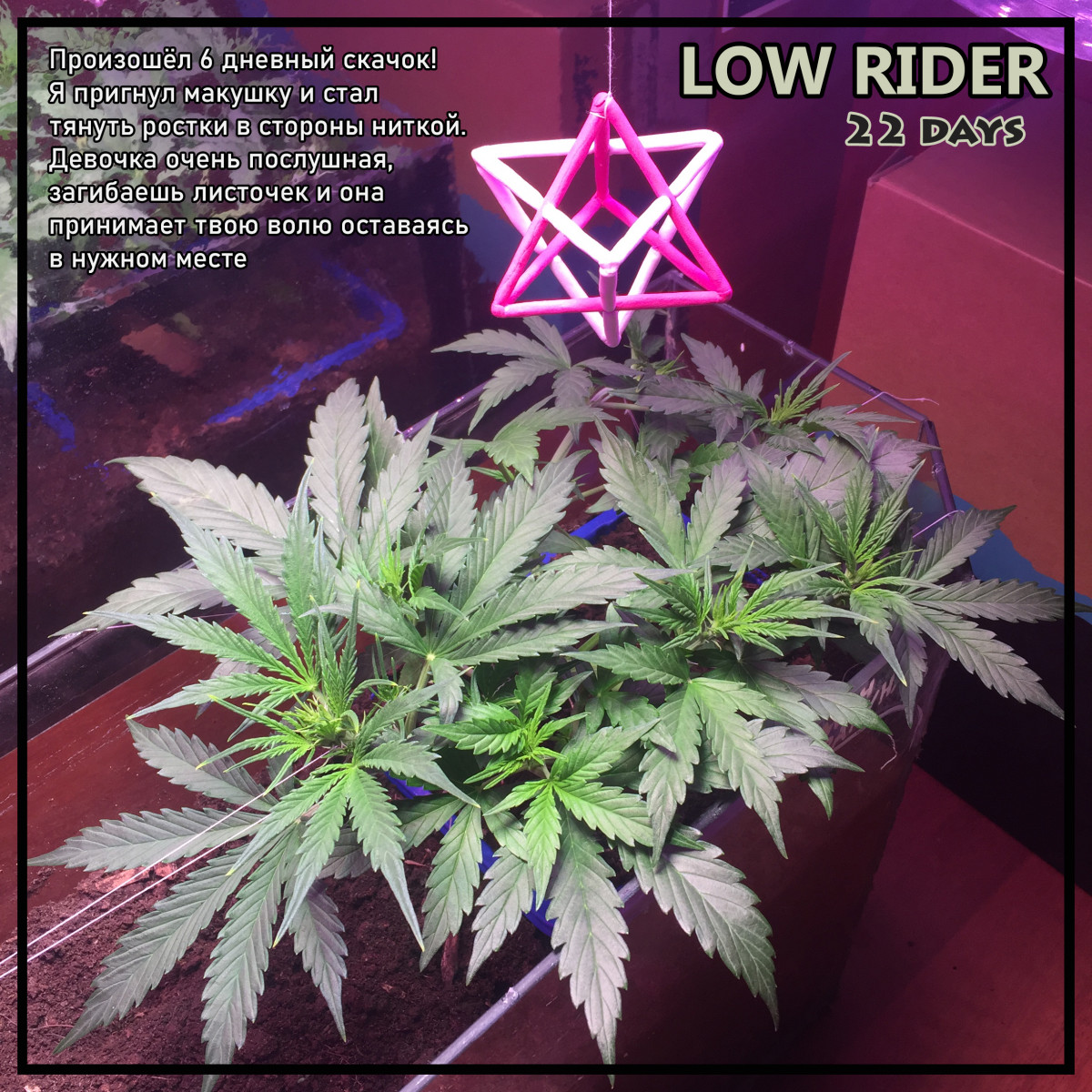 - Общие впечатленияПолевые заметки вы можете наблюдать на фото ниже. Выросла девушка как по паспорту, ей потребовалось ровно 60 дней. В принципе подержать ещё было можно, но мне хотелось сохранить в ней больше сативной лёгкости. Лампы LED 100 Вт если сложить все 3 штуки, каждая светит в своём спектре. Удобрял на всех стадиях обычной органикой для цветов за 110р из садового магазина. Поливал чистой артезианской водой примерно по 1л воды через 2 дня в течении месяца, и раз в 2-3 дня по 1,5л по 2л по настроению. В сумме у меня получилось собрать с 1 куста около 60 - 70г вкусных.